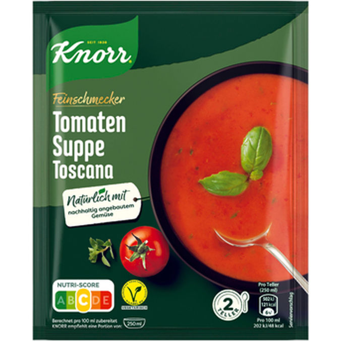Mit der Feinschmecker Tomaten Suppe Toscana gelingt das Essen für die ganze Familie im Handumdrehen! Mit intensivem Tomatengeschmack und feinen Basilikum!
